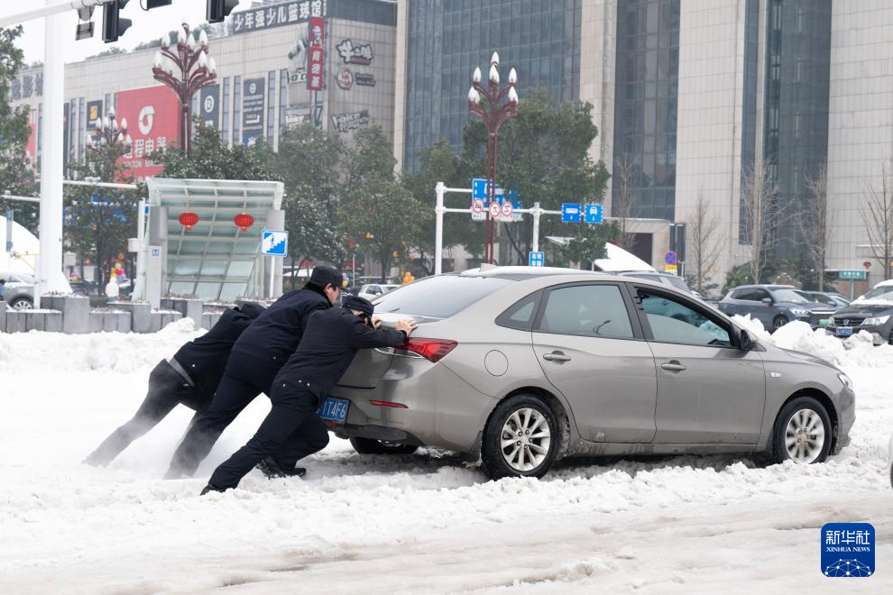 2月4日,在湖南省常德火车站,武陵公安分局站前派出所民辅警帮助打滑车辆脱困。