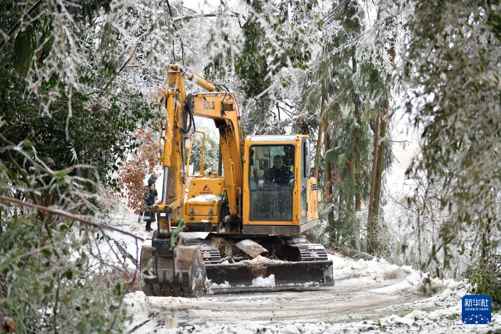 2月5日,挖掘机在湖南省临湘市坦渡镇清理路面积雪与倒伏树枝。