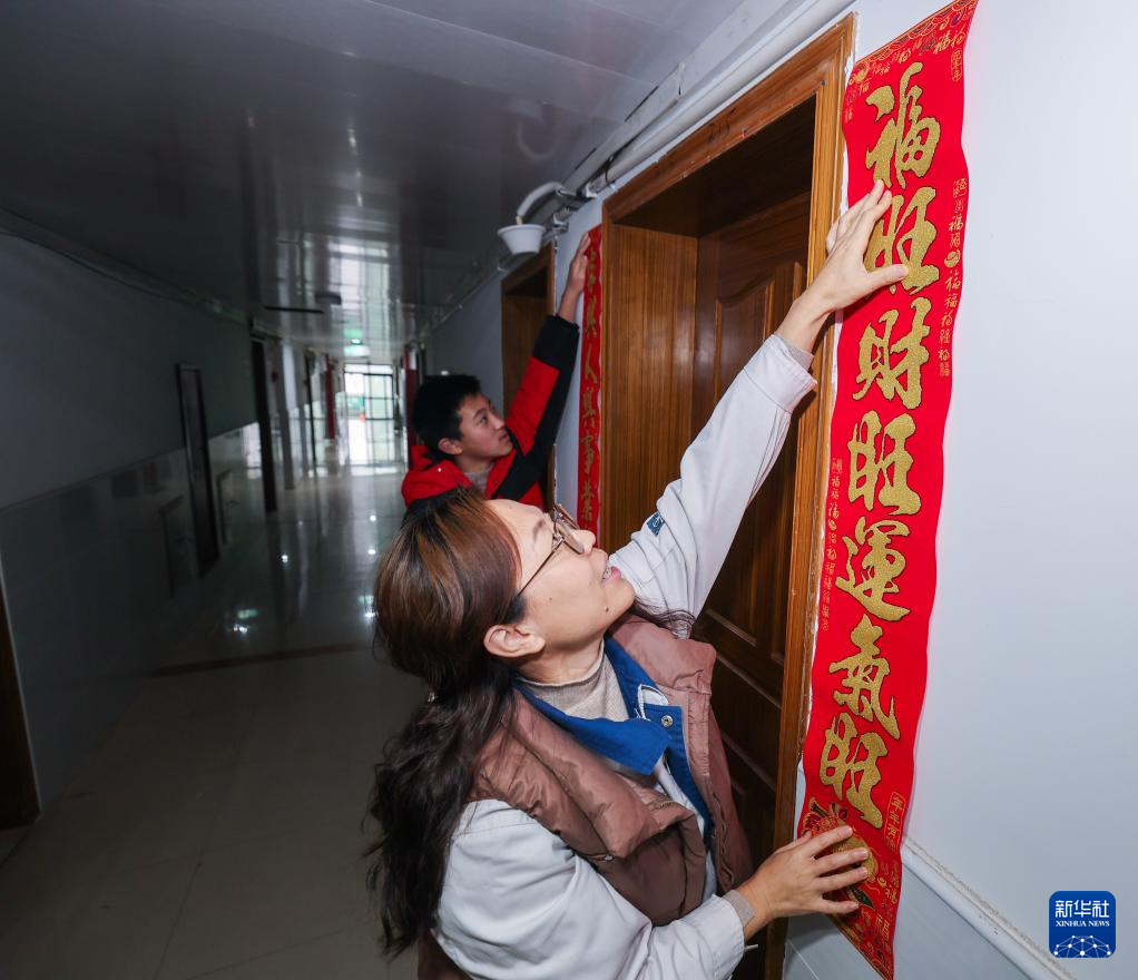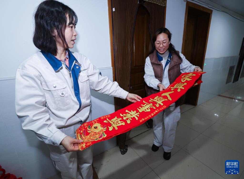 2月6日,在舟山中远海运重工的职工宿舍,企业工会办的工作人员(左)给辽宁籍的员工战研送上新春对联。