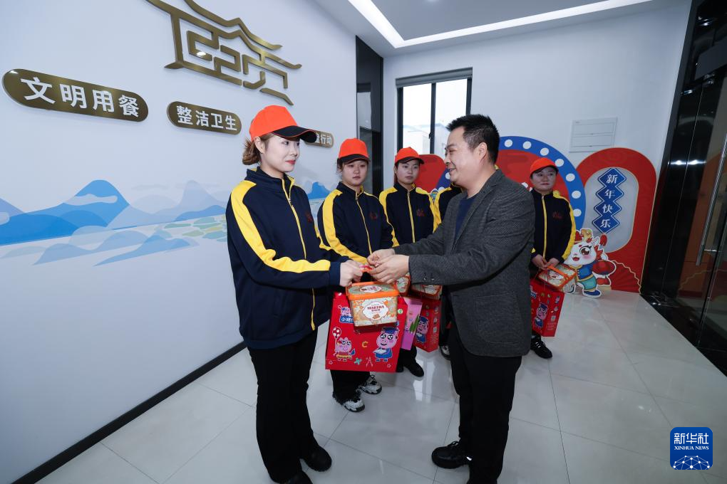 2月6日,在舟山中远海运重工的员工食堂,负责人给春节坚守岗位的员工送上春节礼包。