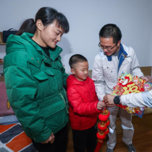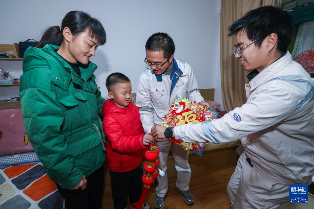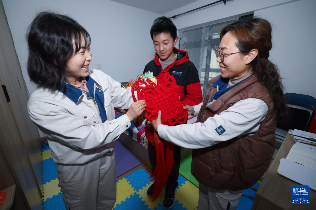 2月6日,在舟山中远海运重工的职工宿舍,企业工会办的工作人员(左)给辽宁籍的员工战研(右)和她来过寒假的儿子送上新春礼物。