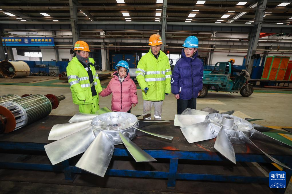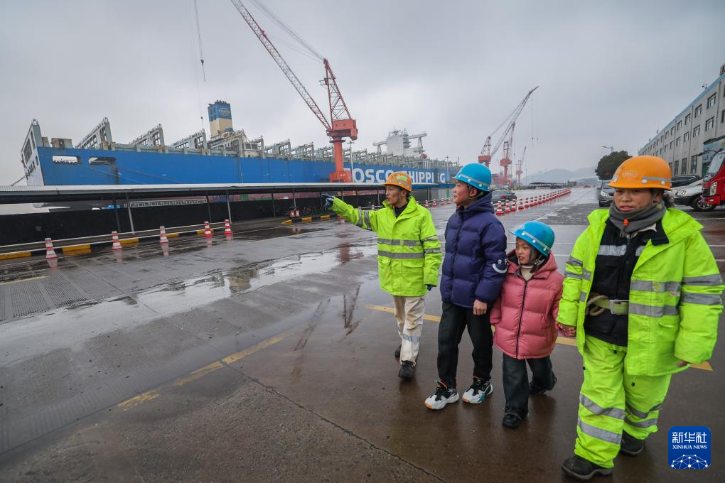 2月6日,在舟山中远海运重工工作的常天帅(左一)和妻子王瑞(右一)带着刚从安徽阜阳来过寒假的儿子女儿一起参观他们工作的地方。