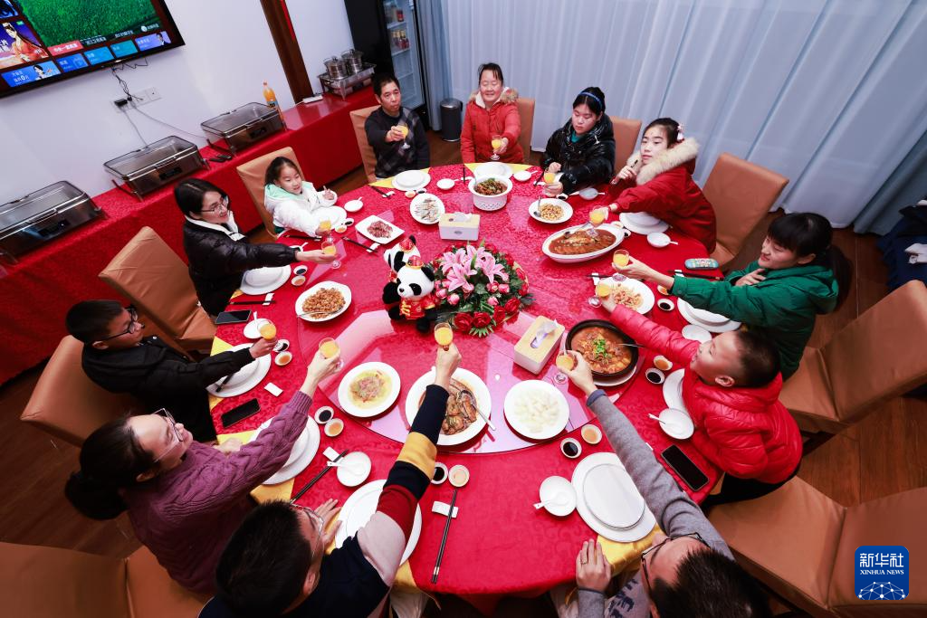 2月6日,在舟山中远海运重工的员工食堂,留在企业过年的船企职工和来过寒假的子女们一起吃新春团圆饭。