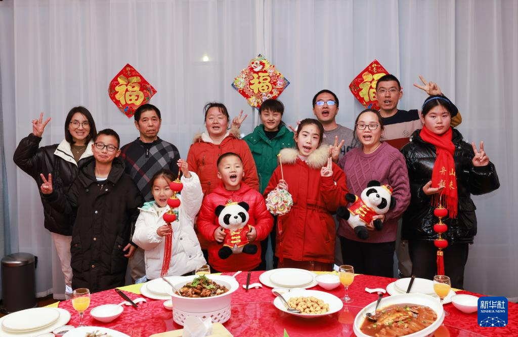 2月6日,在舟山中远海运重工的员工食堂,留在企业过年的船企职工和子女在吃新春团圆饭时合影留念。