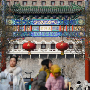 游客在前门大街参观游览,前门五牌楼上装饰有龙纹(2月5日摄)。