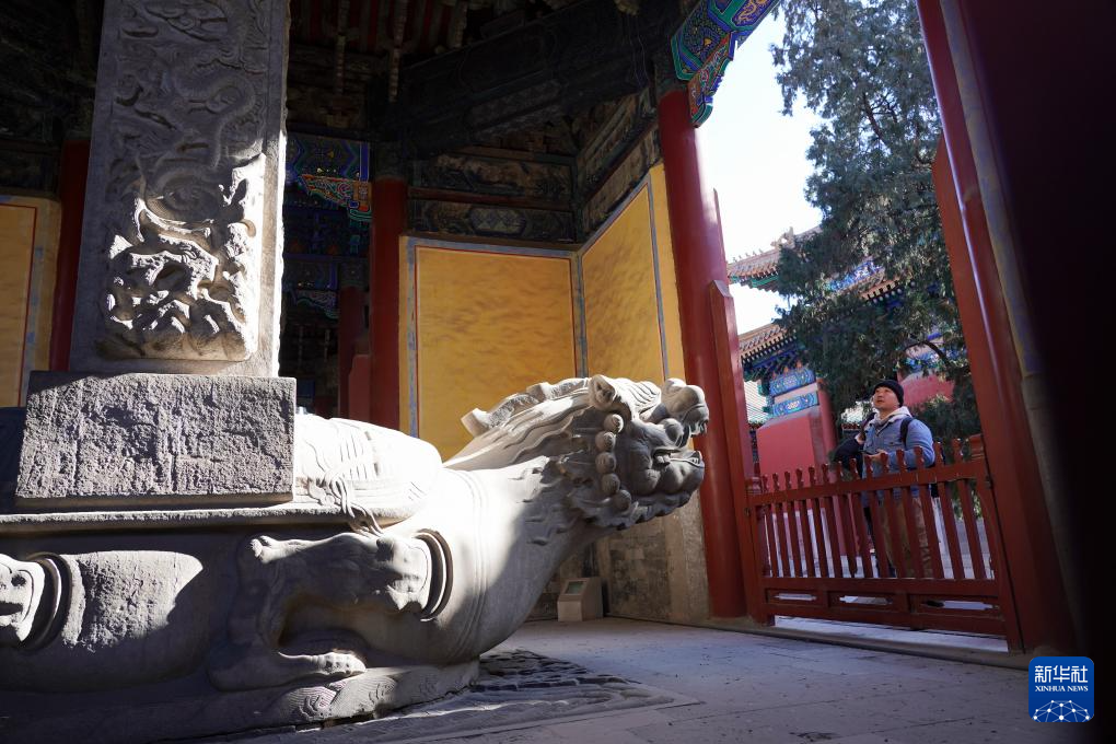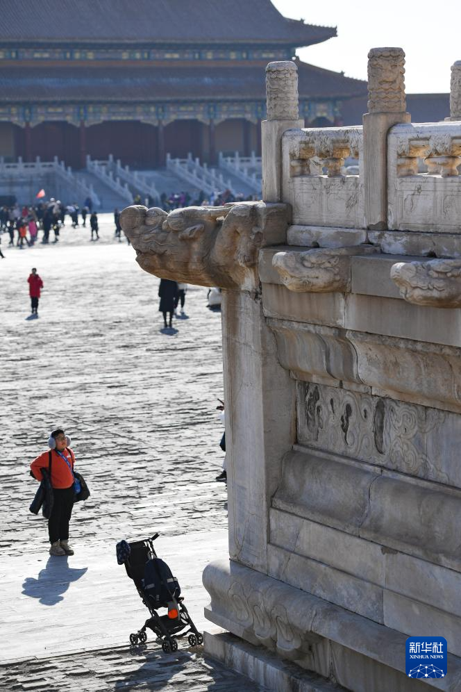 游客在天坛公园参观游览,天坛公园栏杆上雕刻有龙的形象(1月23日摄)。
