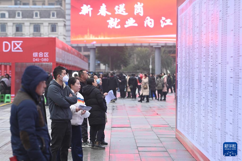 2月5日,求职者在四川省内江市“新春送岗 就业内江”专场招聘活动中了解岗位信息。