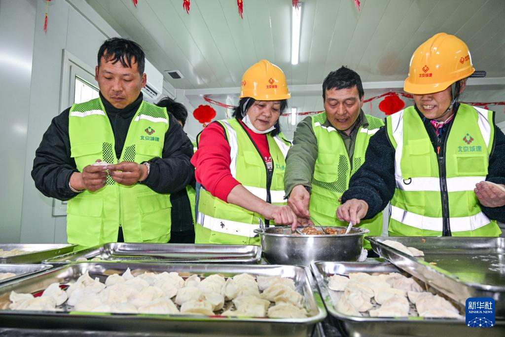 2月6日,北京城建集团树村8号地置换集体产业项目(一标段)的工友一起包饺子。