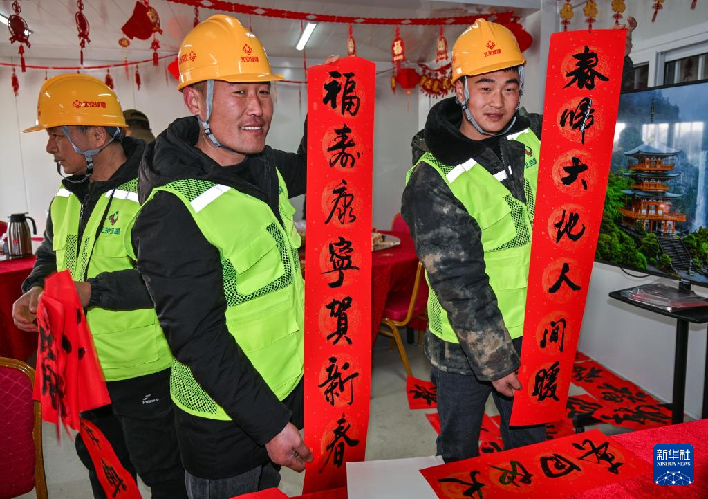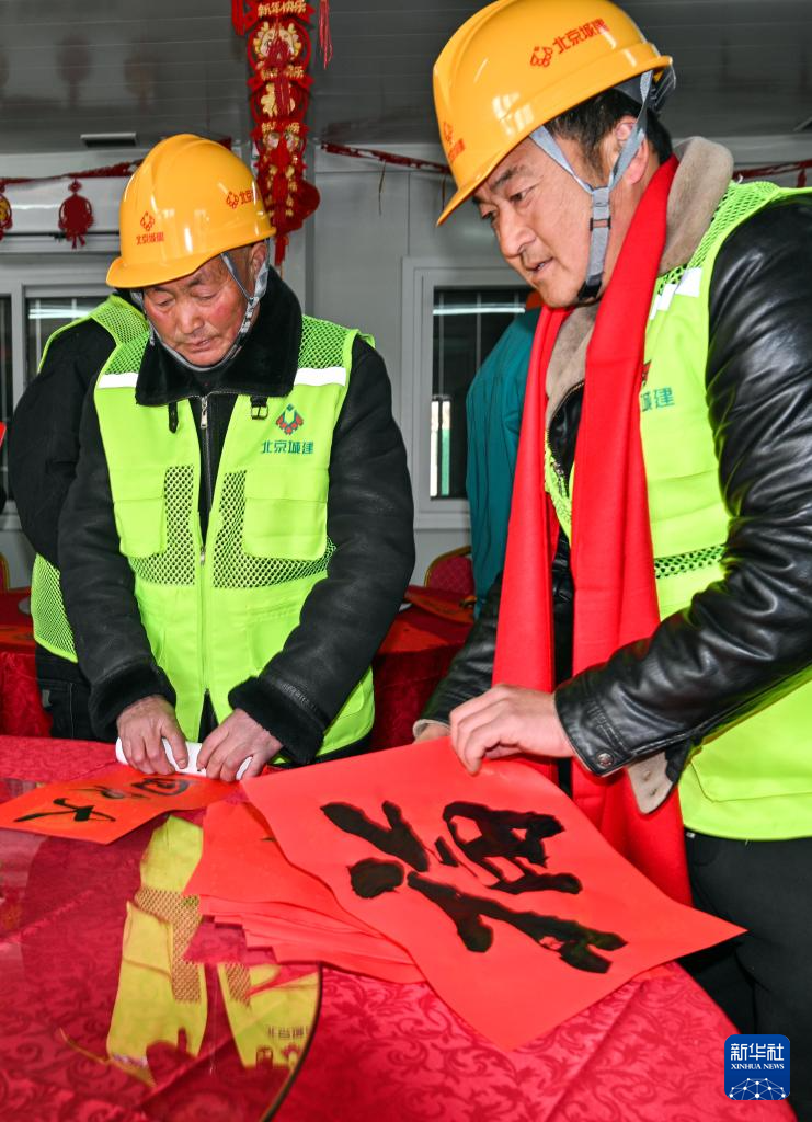 2月6日,北京城建集团树村8号地置换集体产业项目(一标段)的工友领取对联和“福”字。