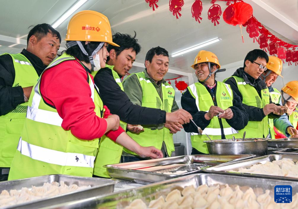 2月6日,北京城建集团树村8号地置换集体产业项目(一标段)的工友一起吃饺子。