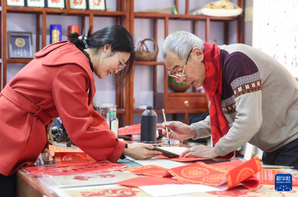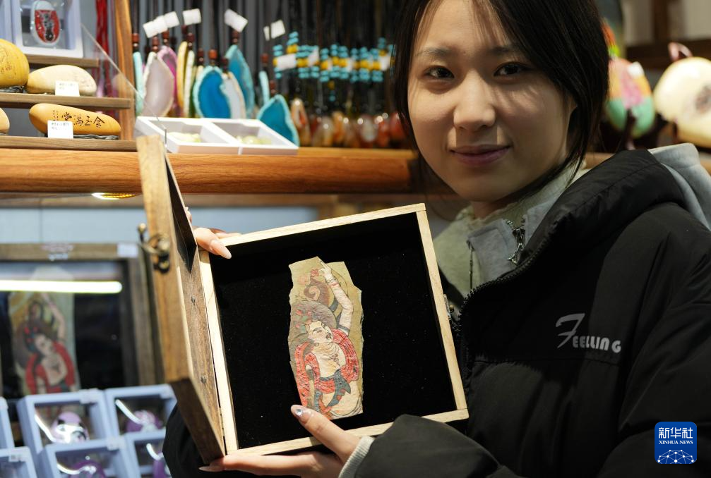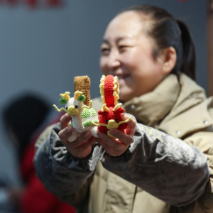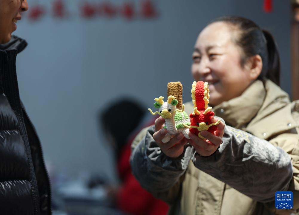 2月5日,在奉国寺内的一家文创馆,当地手工艺人向游客介绍龙年主题编织产品。