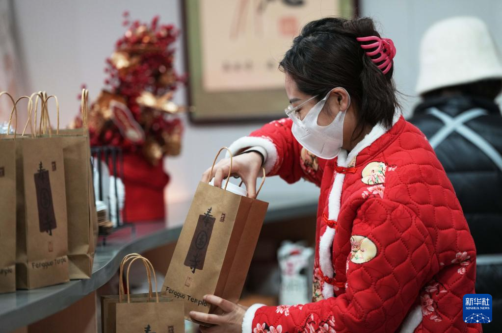 2月5日,奉国寺内一家饮品店的工作人员为顾客打包特色咖啡。