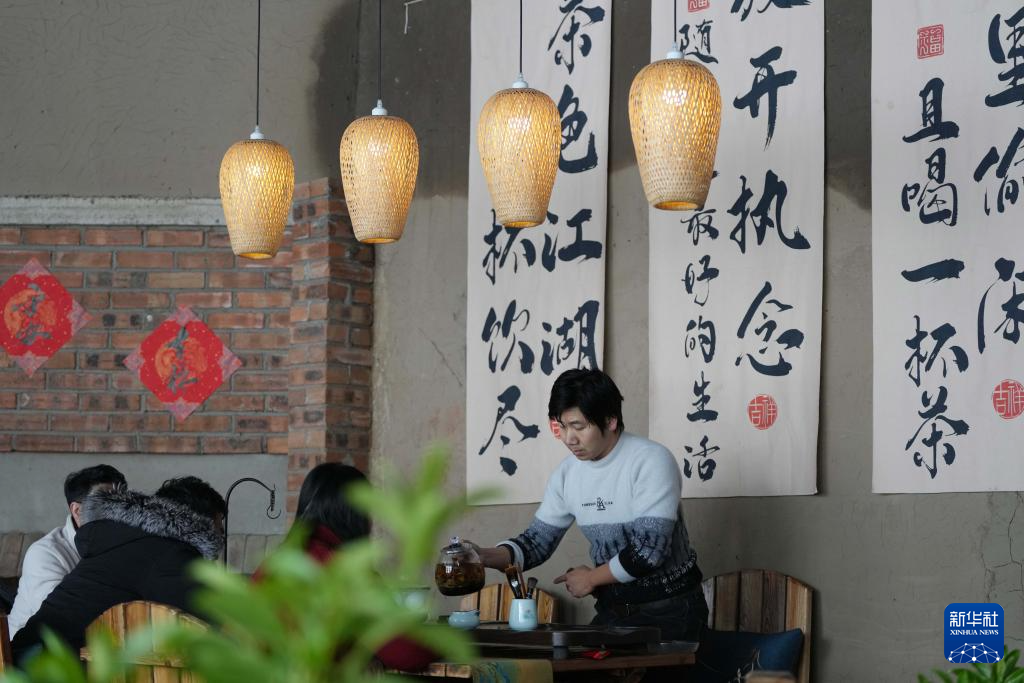 2月5日,游客在奉国寺内的一间茶室品茶聊天。