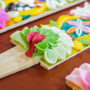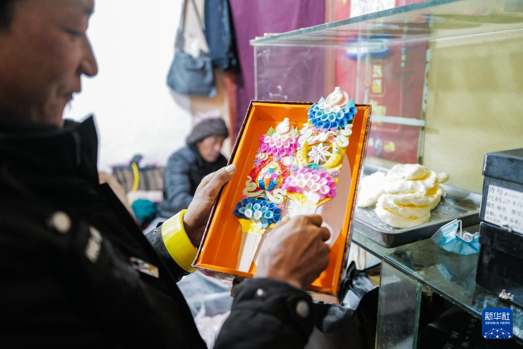 在拉萨八廓商城,制作完成的酥油花被放进盒中存放(2月7日摄)。