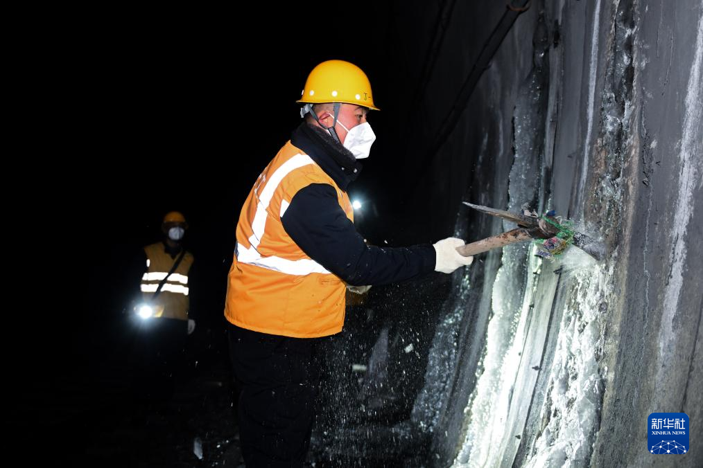 老虎沟隧道位于青海省西宁市湟源县境内,平均海拔3100米,由于昼夜温差大,每年冬季,渗漏的地下水在隧道内容易冻结冰柱和冰锥,如果清理不及时,会给行车安全埋下隐患。为了确保春运期间行车安全,中国铁路青藏集团有限公司西宁工务段湟源桥隧车间职工加大检查频次,及时进行除冰工作,守护青藏铁路设备安全。