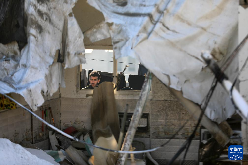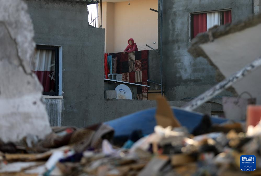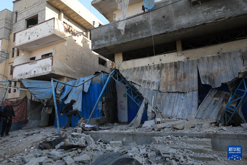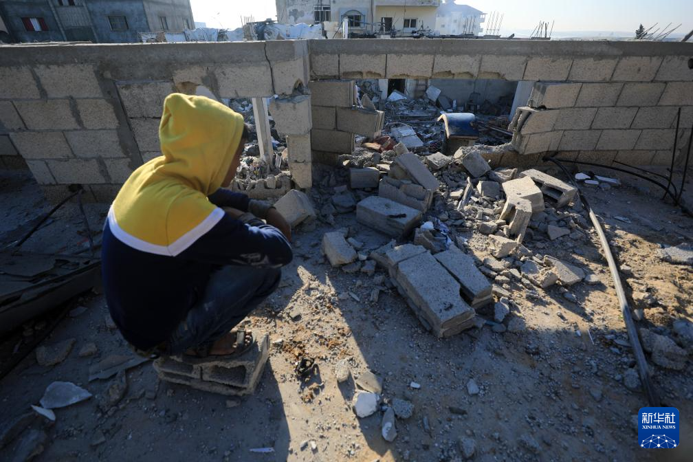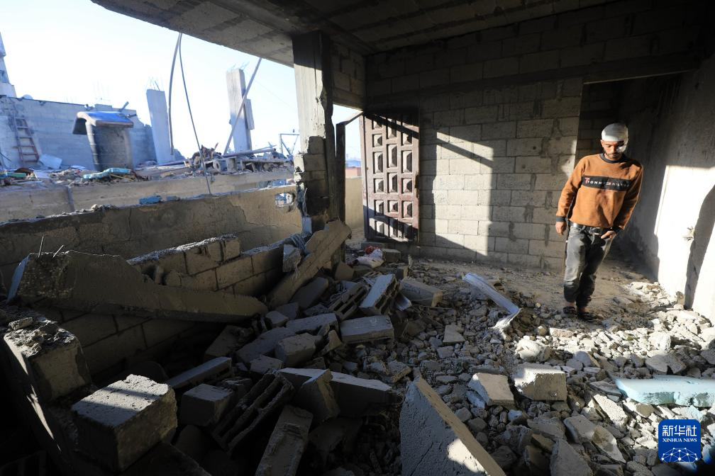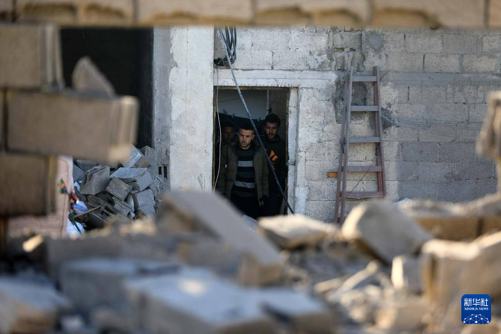 2月7日,在加沙地带南部城市拉法,巴勒斯坦人查看遭轰炸损毁的建筑。