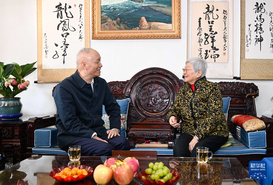 2月7日上午,中共中央政治局常委、中央书记处书记蔡奇代表习近平总书记和党中央看望文化界知名人士和科技专家,向他们致以诚挚问候,向广大文化工作者和科技工作者致以新春祝福。这是蔡奇看望中国工程院院士、空间技术专家戚发轫。