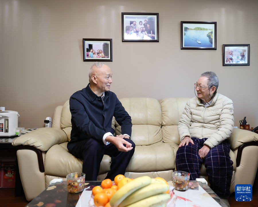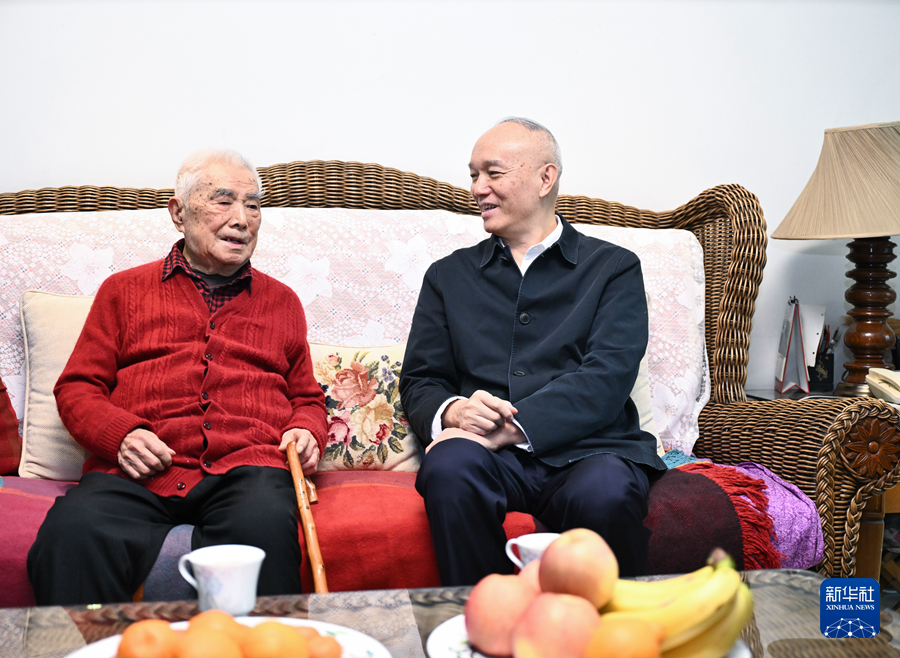 2月7日上午,中共中央政治局常委、中央书记处书记蔡奇代表习近平总书记和党中央看望文化界知名人士和科技专家,向他们致以诚挚问候,向广大文化工作者和科技工作者致以新春祝福。这是蔡奇看望中国科学院院士、放射化学专家王方定。