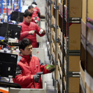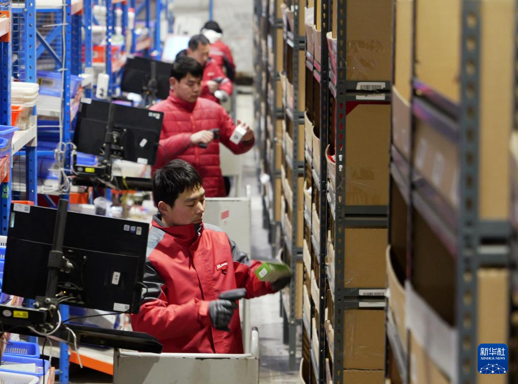 2月7日,在京东物流郑州亚一物流园区,工作人员在拣选货物。
