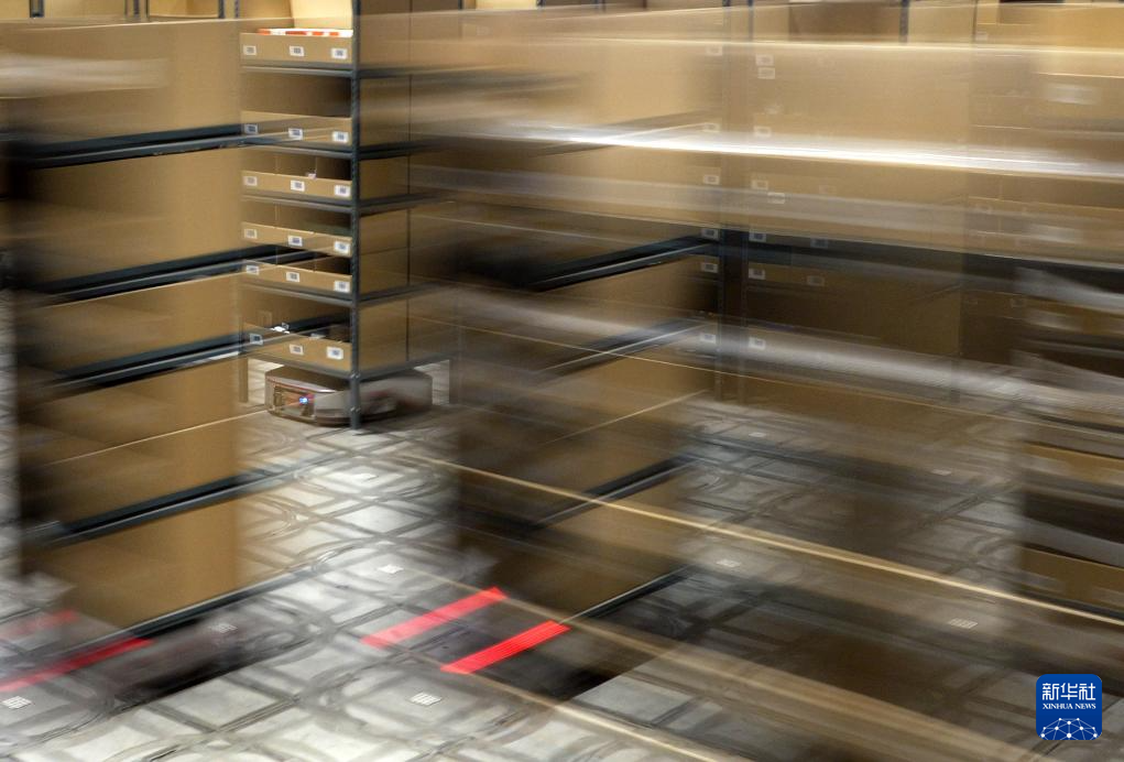 2月7日,在京东物流郑州亚一物流园区,智能拣选搬运机器人在作业。