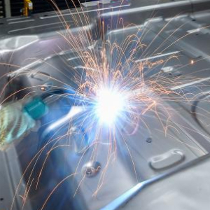 2月7日,在位于吉林长春的一汽解放汽车有限公司卡车厂焊装车间内,工作人员对零部件进行焊接作业。