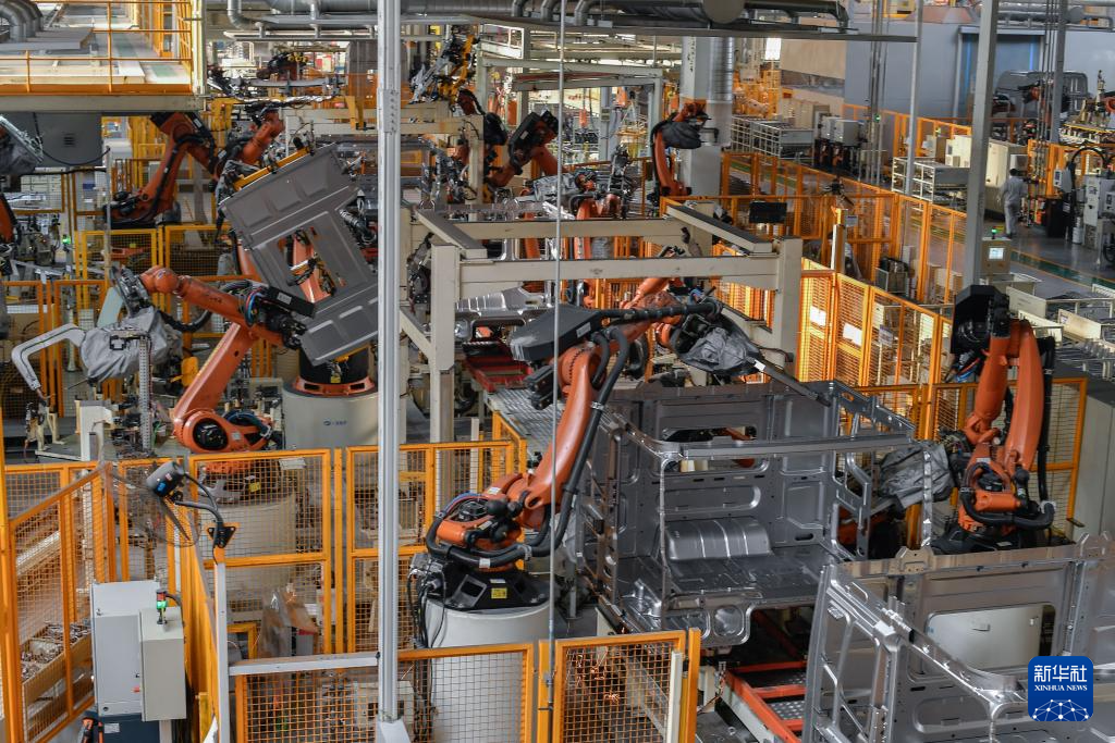 2月7日,在位于吉林长春的一汽解放汽车有限公司卡车厂焊装车间内,流水线上的机器人对零部件进行焊接作业。