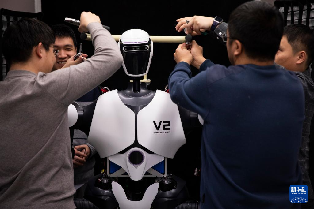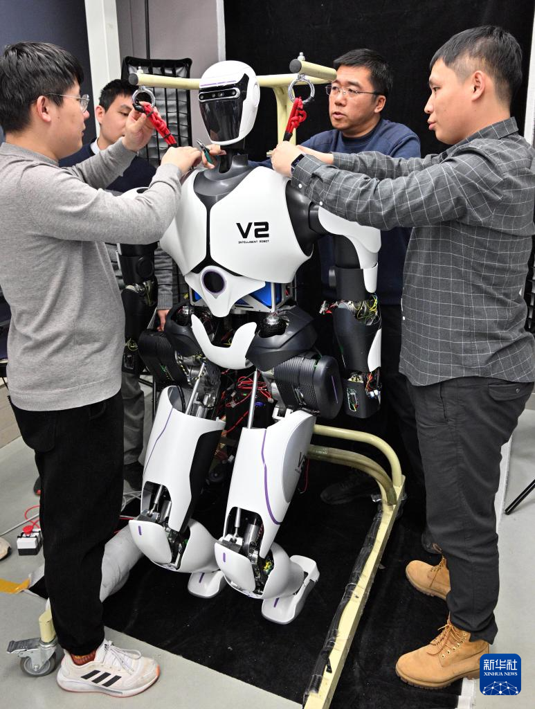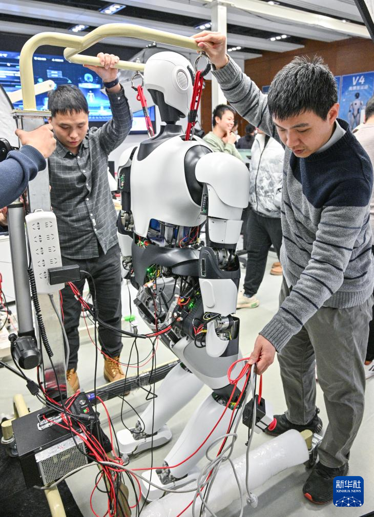 1月31日,人形机器人攻关团队科研人员在多模态人工智能系统全国重点实验室调试机器人。