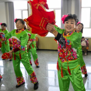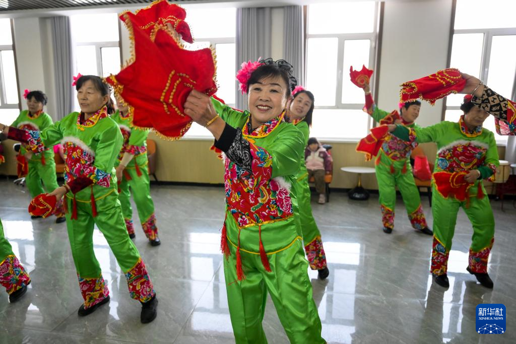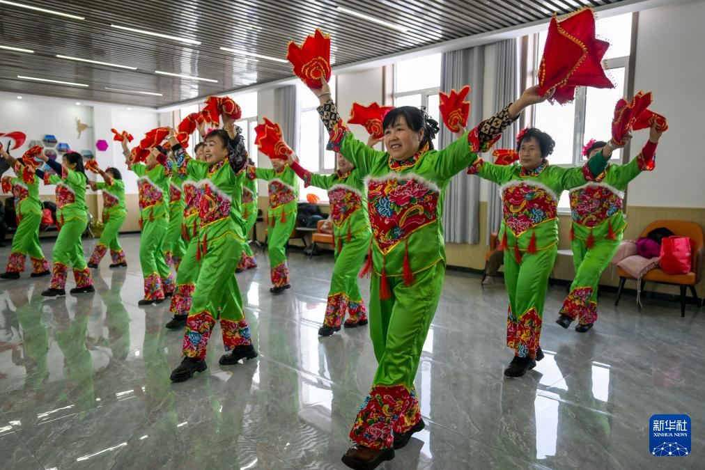 2月6日,田家圪旦新村村民在德胜泰村党群服务中心活动室排练舞蹈。