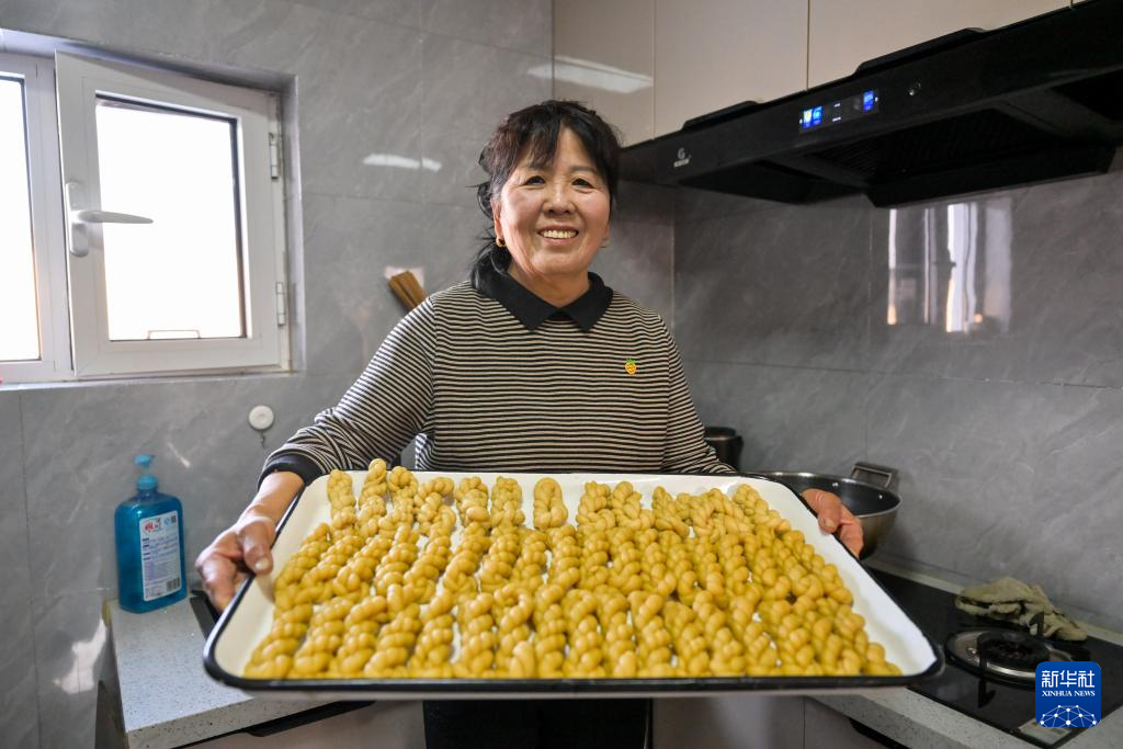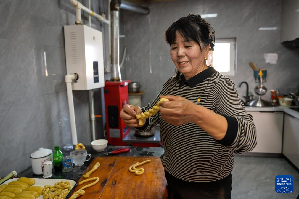 2月6日,田家圪旦新村村民王果花在家中做麻花。