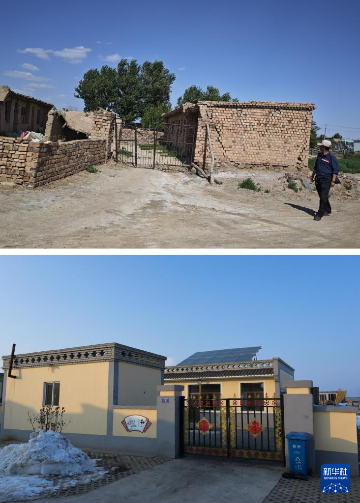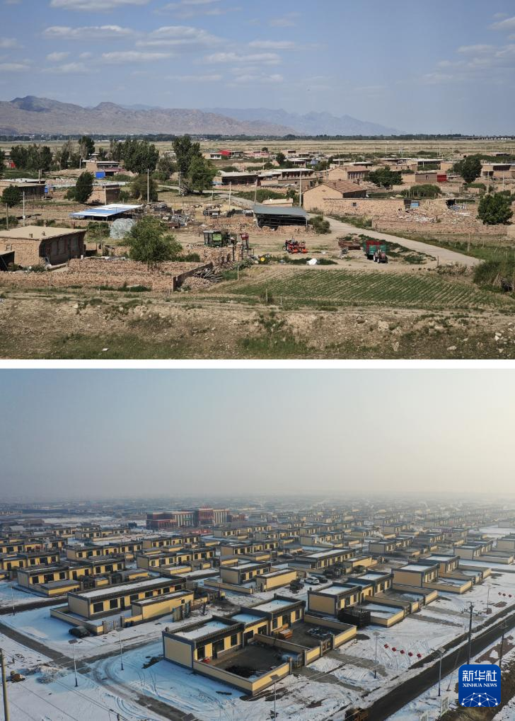 拼版照片:上图为2023年6月8日拍摄的田家圪旦村拆除前的一处房舍(新华社记者贾立君摄);下图为2024年2月6日拍摄的田家圪旦新村的一处房舍(新华社记者李志鹏摄)。