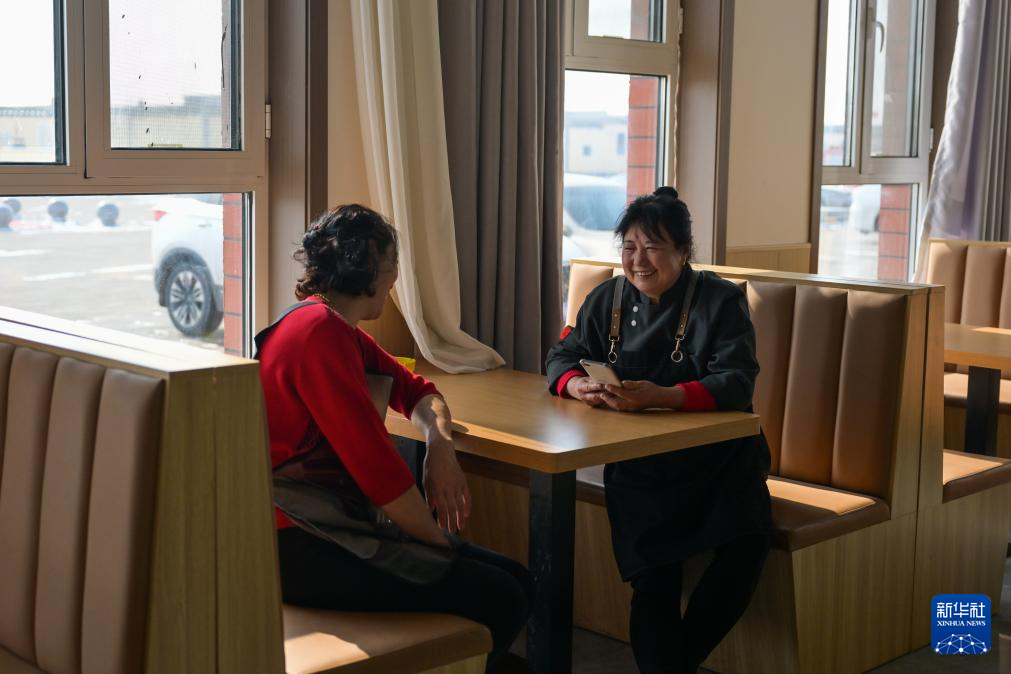 2月6日,田家圪旦新村村民葛秀珍(右)在村里的一家餐馆与村民聊天。