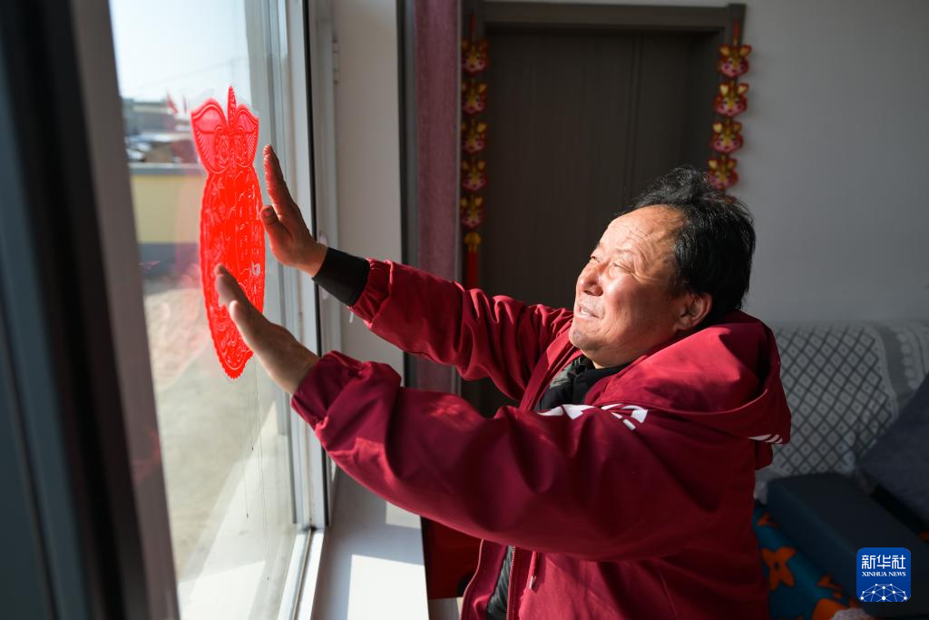 2月6日,田家圪旦新村村民侯拴明在家中贴窗花。