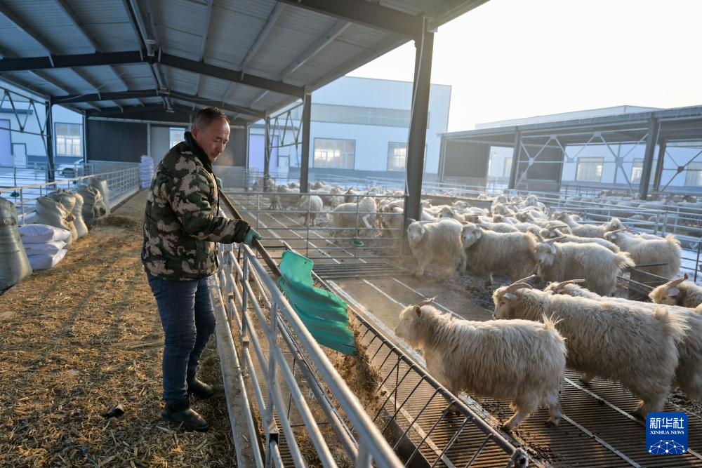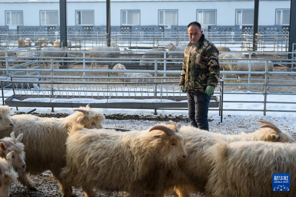 2月7日,田家圪旦新村村民张金狗在养殖场查看羊的生长情况。