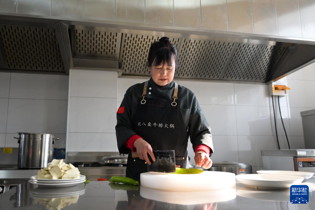 2月6日,田家圪旦新村村民葛秀珍在村里的一家餐馆切菜。搬到新村后,葛秀珍到餐馆就业,一个月能有约4000元的收入。