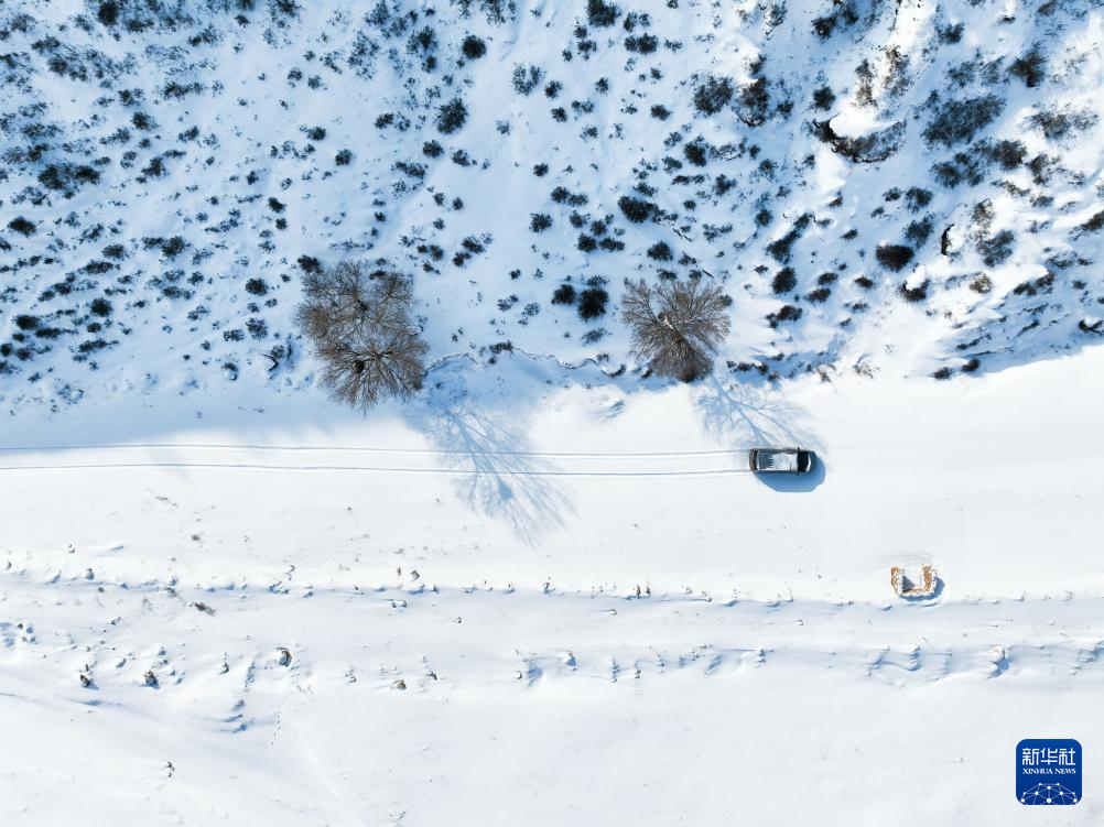 2月7日,刘贵兵和同事乘车在辖区内巡护(无人机照片)。