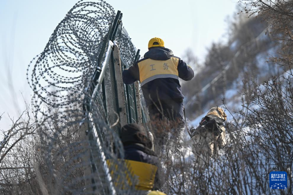2月7日,刘贵兵(左)和同事在修补防护栏。
