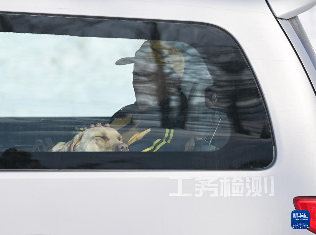 2月7日,在巡护完一个山头后,刘贵兵在车里抚摸“大黄”的头。