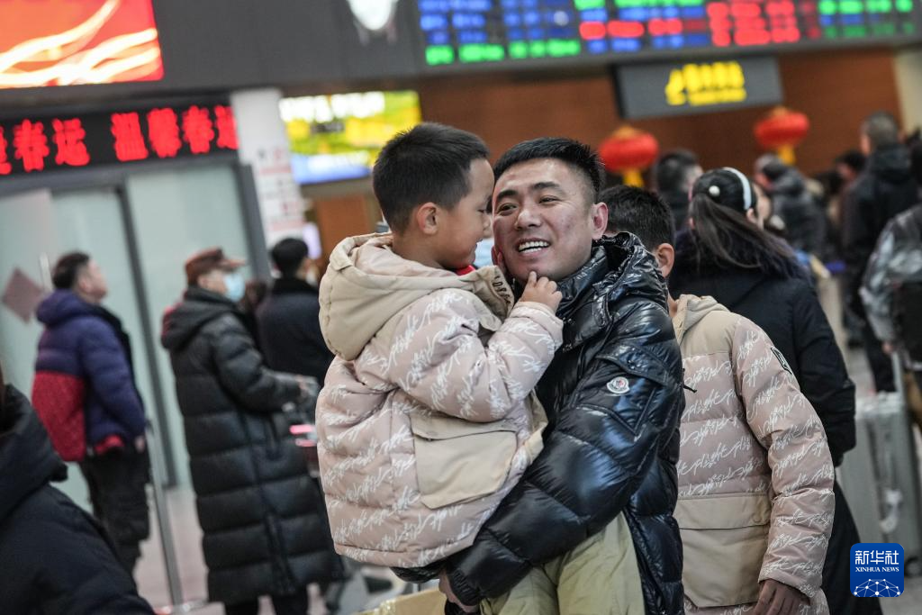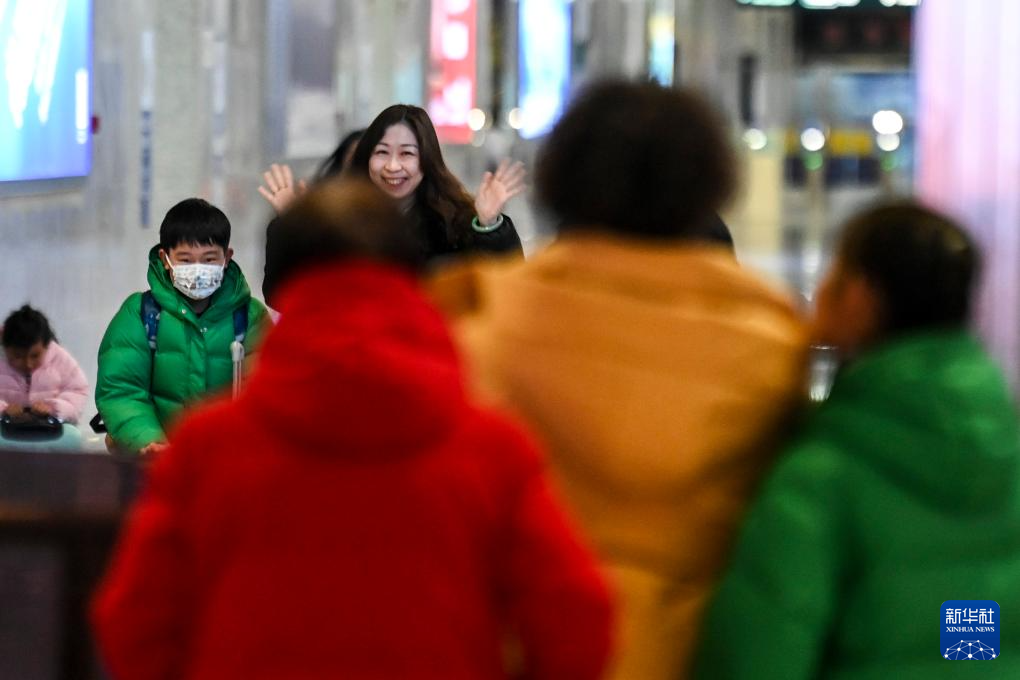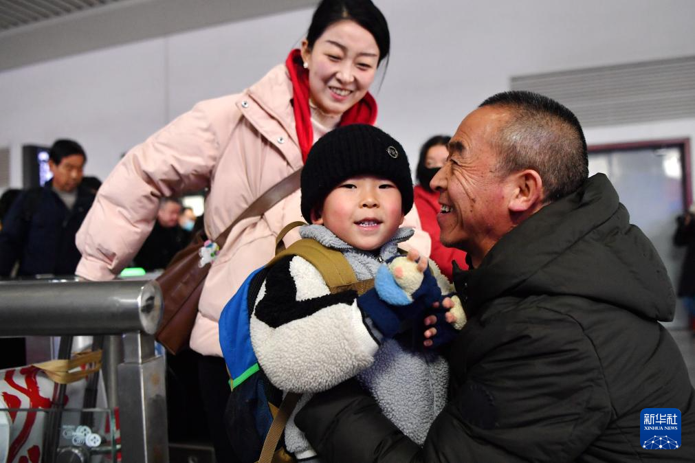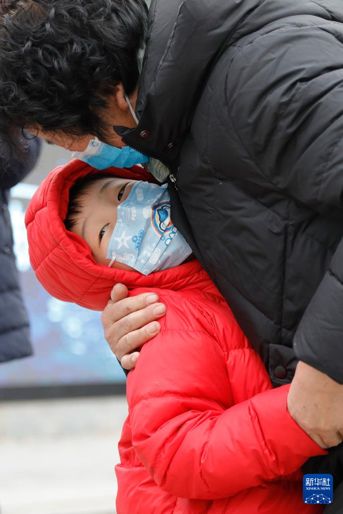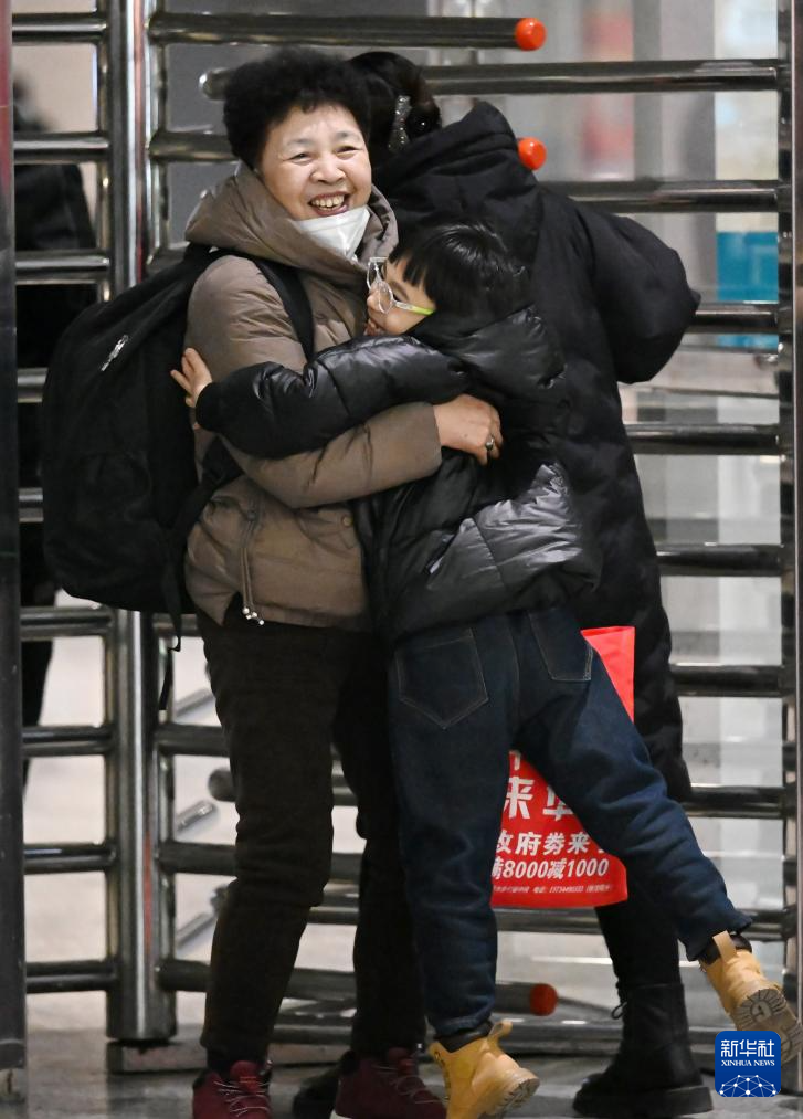 2月5日,在天津西站出站口,来自东北的闫女士和在此接站的孙子相拥。