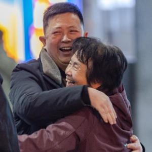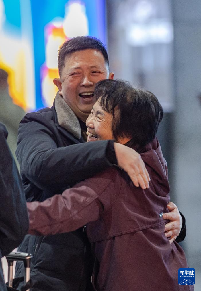 2月5日,在重庆北站北广场,赵兴松(左)与从黑龙江来重庆过年的姨妈拥抱。