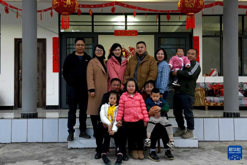 2月6日,在云南省大理白族自治州南涧彝族自治县公郎镇沙乐村,张红径(后排中)从北京回到老家和家人合影。