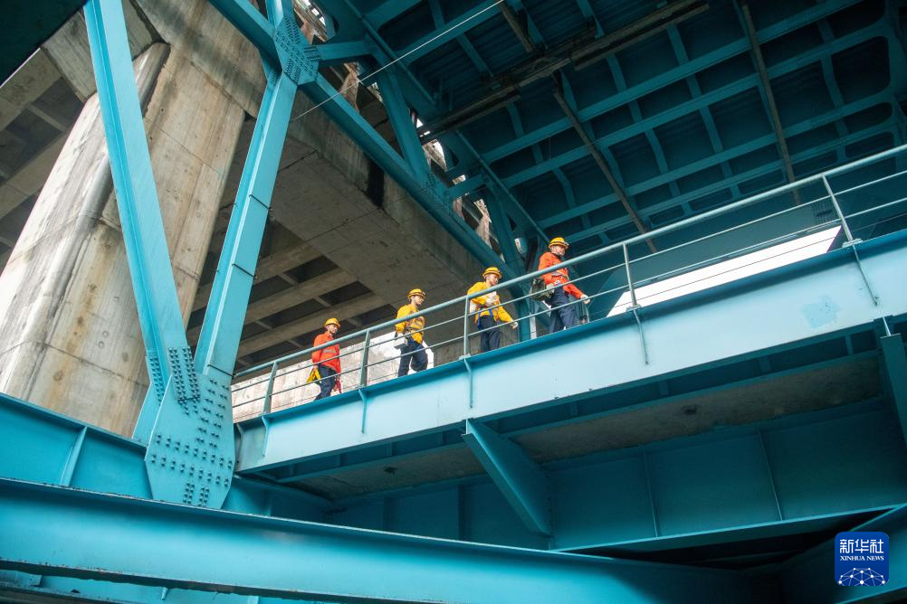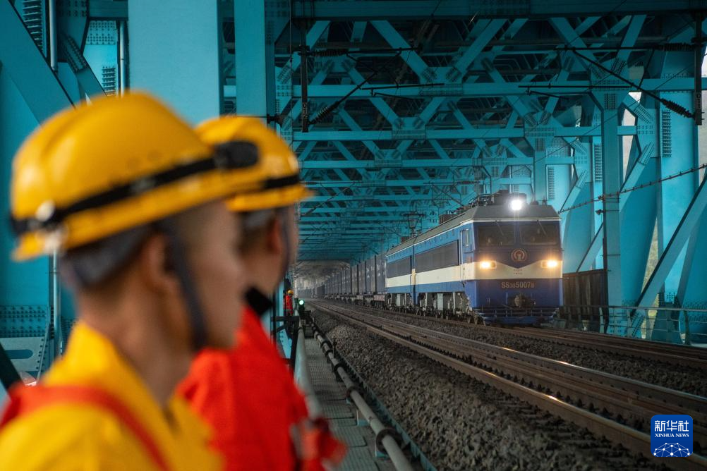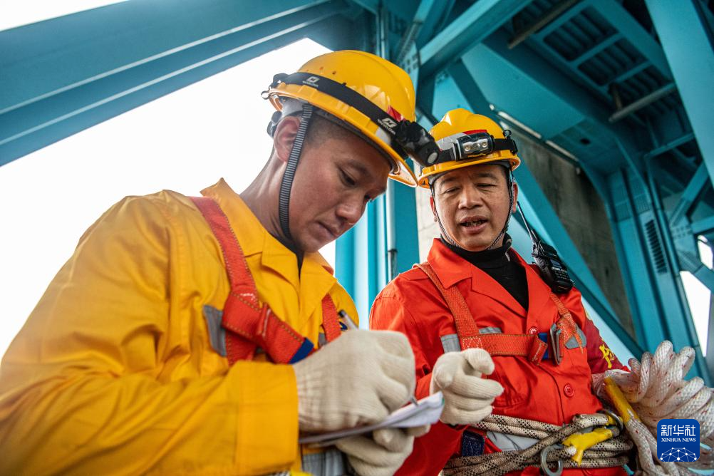 2月8日,重庆工务段重庆桥路车间的桥隧工人在新白沙沱长江特大桥进行检查作业。