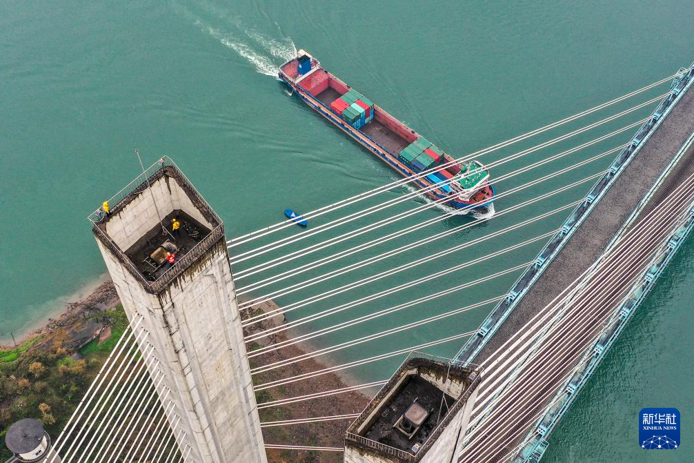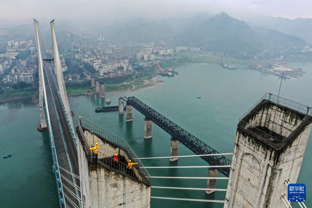 2月8日,桥隧工人在新白沙沱长江特大桥塔顶进行检查作业(无人机照片)。