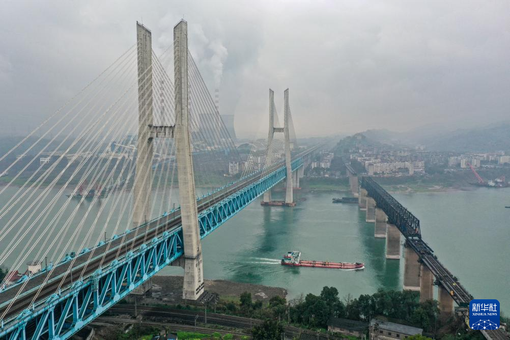 这是2月8日拍摄的渝贵铁路线上的新白沙沱长江特大桥(无人机照片)。