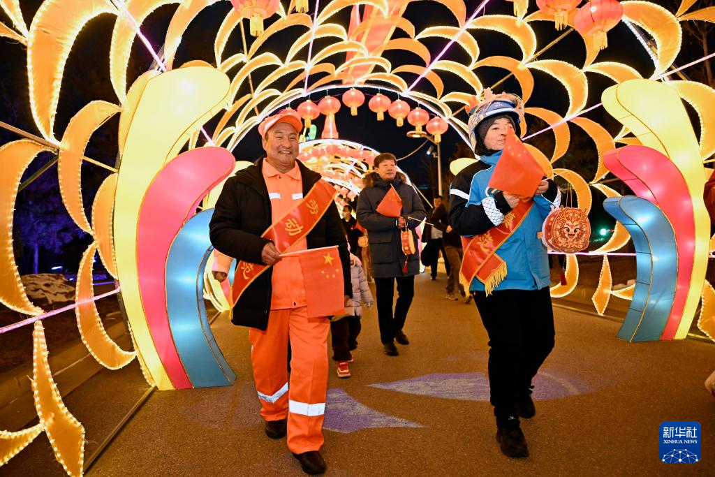 2月7日,宁夏银川市举行“百名劳模赏花灯、迎新春”活动,劳动模范代表在银川市金凤区阅海湾水上公园赏花灯。