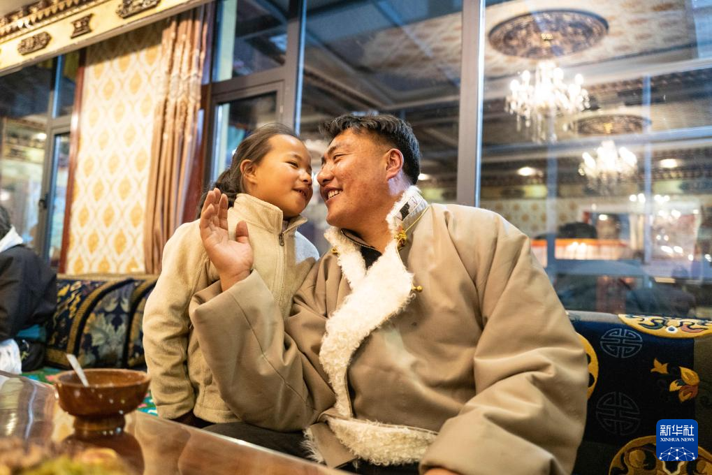在位于西藏拉萨市当雄县公塘乡甲根村的家中,斯曲旺姆的孙子巴桑罗布(右)和重孙女央金拉姆在饭后聊天(2月8日摄)。