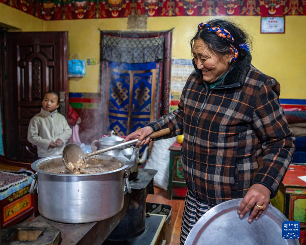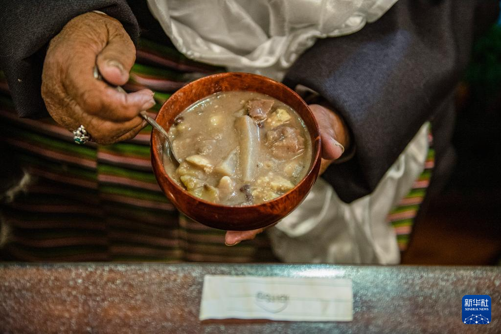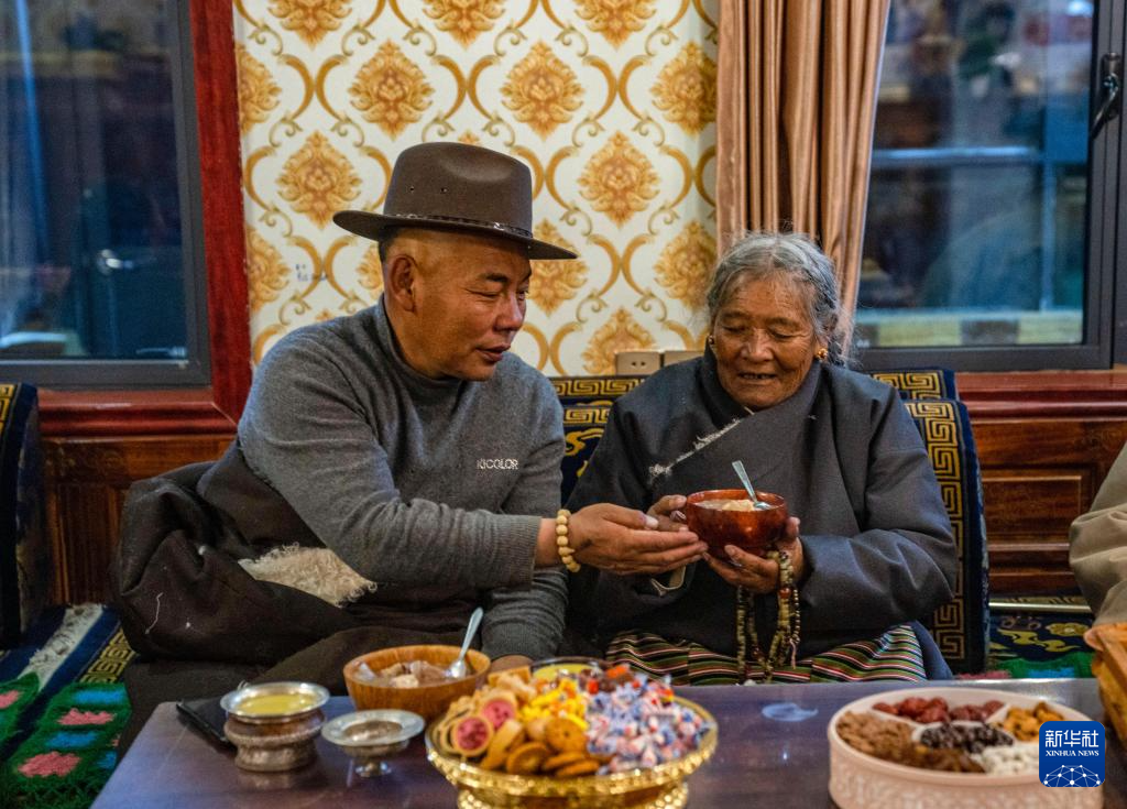 在位于西藏拉萨市当雄县公塘乡甲根村的家中,斯曲旺姆的儿子索朗罗达为母亲端上“古突”(2月8日摄)。