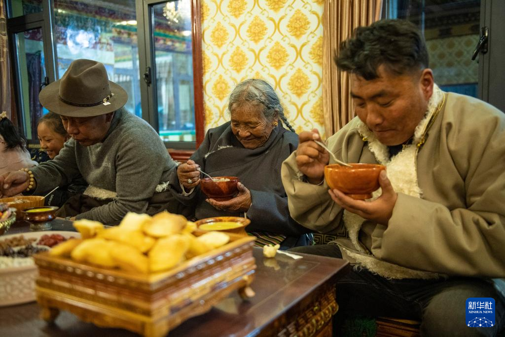 在位于西藏拉萨市当雄县公塘乡甲根村的家中,斯曲旺姆(右二)和家人在吃“古突”(2月8日摄)。