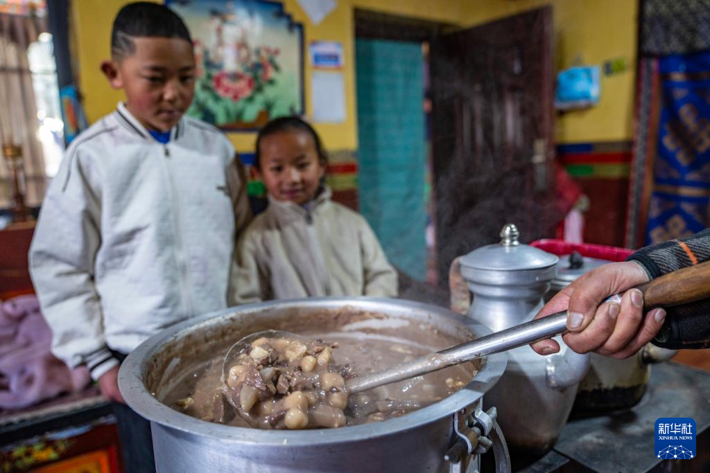 在位于西藏拉萨市当雄县公塘乡甲根村的家中,斯曲旺姆的重孙子和重孙女在等待“古突”上桌(2月8日摄)。