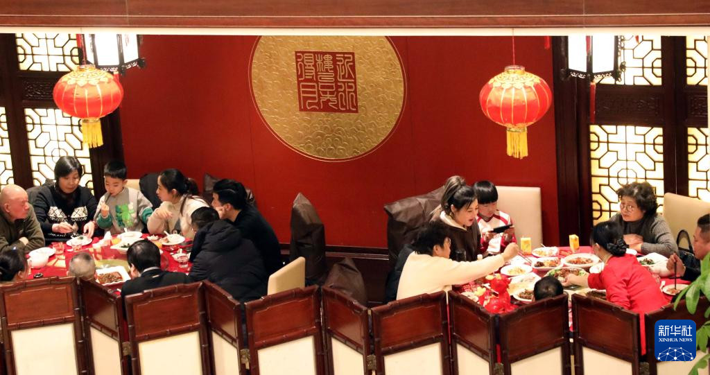 2月9日,人们在江苏省苏州市一家餐馆内享用团圆饭。