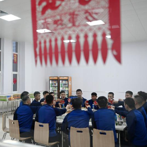 2月9日,在天津市津南区南环路消防救援站,消防人员在食堂一同吃年夜饭。